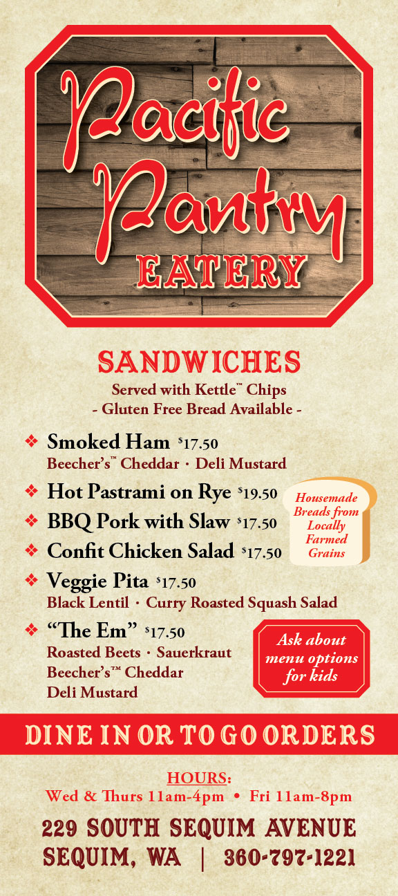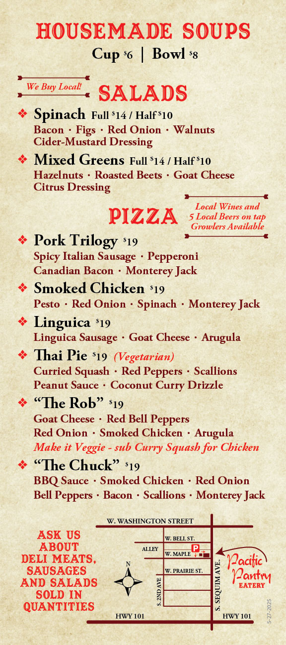 We also produce all our own meats in house with out the use of added nitrates nitrites or preservatives. When you dine at Pacific Pantry you will also have the opportunity to not only enjoy our delicious food but also enjoy some locally produced sodas, beer, ciders and wines.